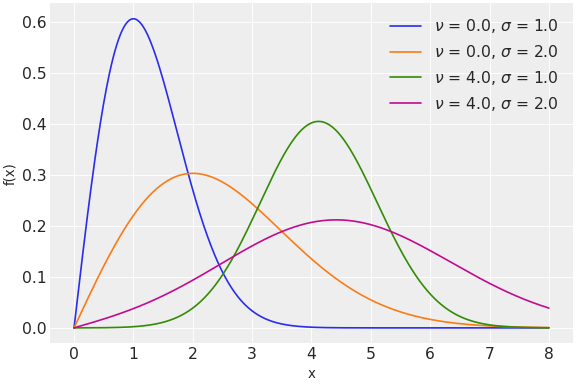 \[f(x\mid \nu ,\sigma )= {\frac {x}{\sigma ^{2}}}\exp \left({\frac {-(x^{2}+\nu ^{2})}{2\sigma ^{2}}}\right)I_{0}\left({\frac {x\nu }{\sigma ^{2}}}\right),\]